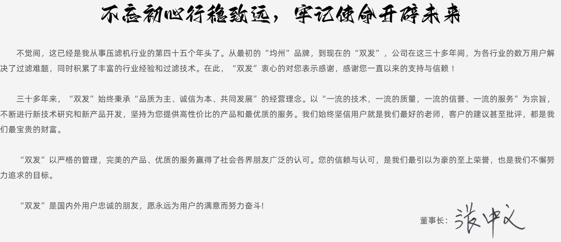 “濾污水為清泉,變污泥為凈土,還廢礦渣為青山綠地”,誠信塑品牌,質(zhì)量出名牌。三十多年來,“雙發(fā)”始終秉承“品質(zhì)為主、誠信為本、共同發(fā)展”的經(jīng)營理念。以“一流的技術(shù),一流的質(zhì)量,一流的信譽(yù)、一流的服務(wù)”為宗旨。不斷進(jìn)行新技術(shù)研究和新產(chǎn)品開發(fā),堅(jiān)持為用戶提供高性價(jià)比的產(chǎn)品和最優(yōu)質(zhì)的服務(wù)。