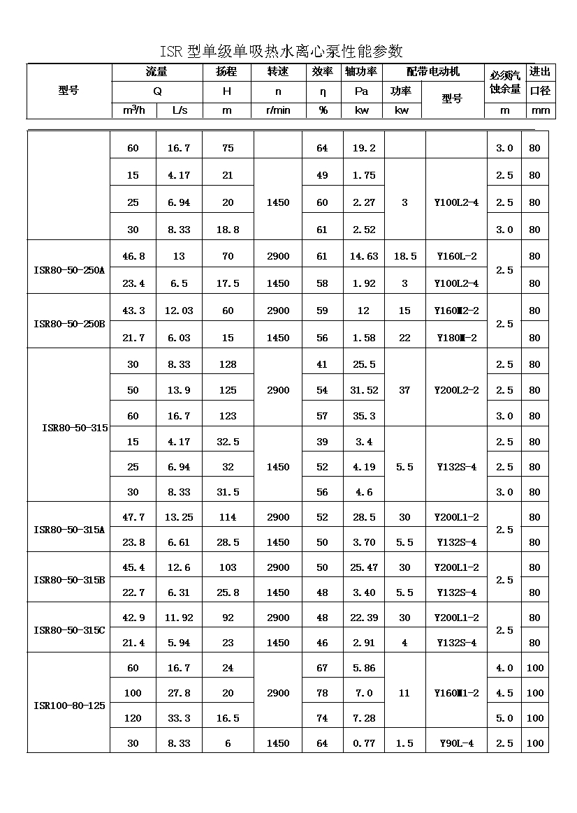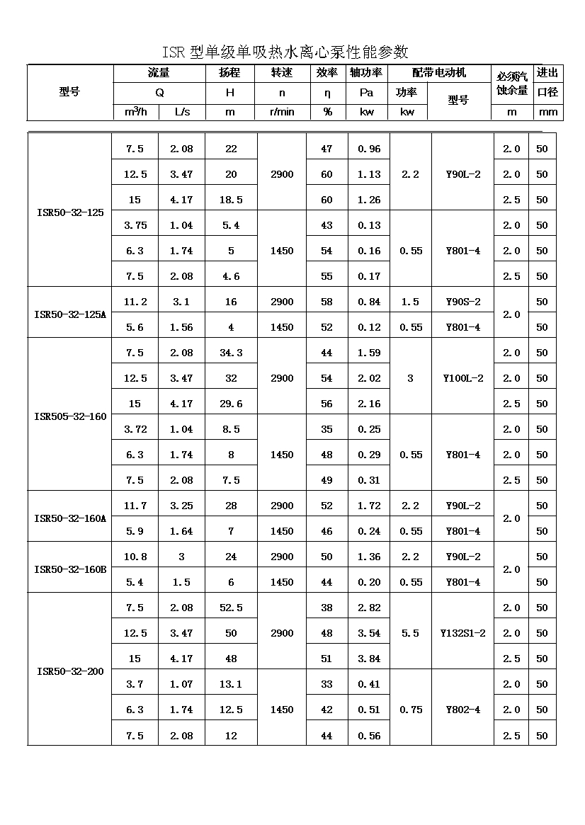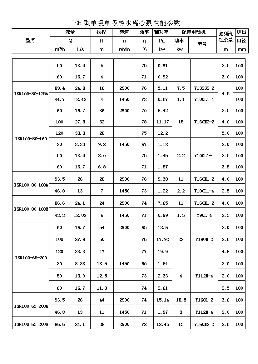 ISR系列單級單吸熱水離心泵適用于輸送不含固體顆粒的清水或物理化學性質類似于清水的其他液體,被輸送介質的溫度在-20℃~+150℃之間,泵的***高工作壓力布大于1.6MPa,吸入口壓力不大于0.8MPa,適用于工廠、礦山、城市給派水,特別是城鄉集中供熱、供水系統。其性能參數范圍為: