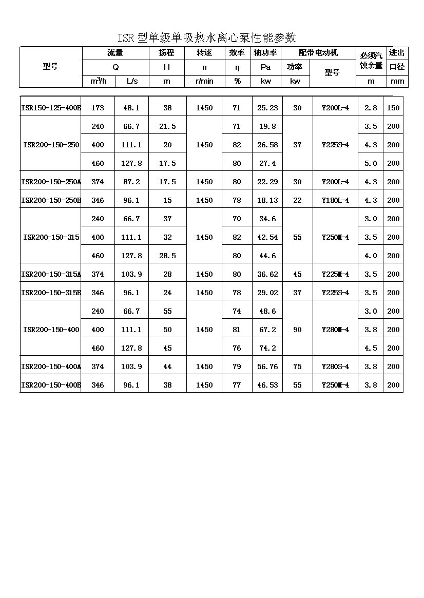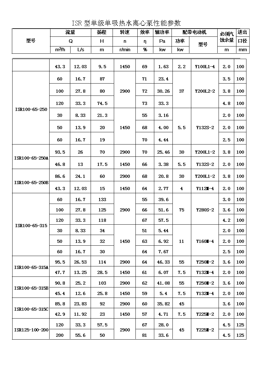 ISR系列單級單吸熱水離心泵共有二十九種基本型,為滿足用戶對泵的不同性能要求,我廠采用了切割葉輪外徑的方法,從而增多了ISR泵的規格。